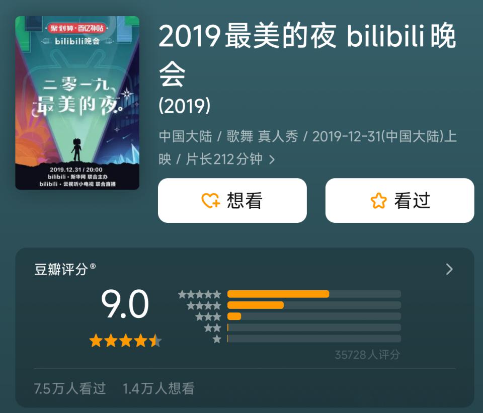 雷同的线上拼盘演唱会陷入疲劳期时,更年轻形态的跨年晚会开始崛起。2019 年,B 站举办了站内第一届跨年晚会“最美的夜”,同时在线人数超过 8000 万,晚会贴近平台原生的内容生态,突出情怀、复古、玩梗等元素,豆瓣评分高达 9.0 分,被媒体评价为“最懂年轻人的晚会”。